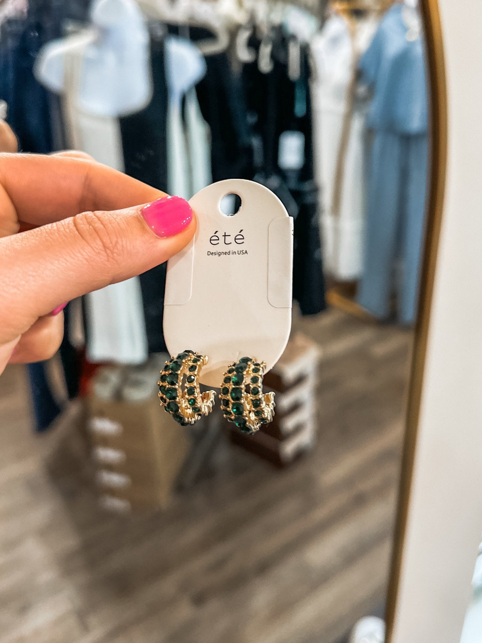 Make them green with envy 💚 The 3 Row Green Rhinestone Hoops pack a punch in a petite .75” size, featuring triple rows of rich emerald-toned rhinestones set in a gold-tone base. These mini statement-makers are perfect for holiday sparkle, school spirit, or adding a luxe pop of color to your everyday.