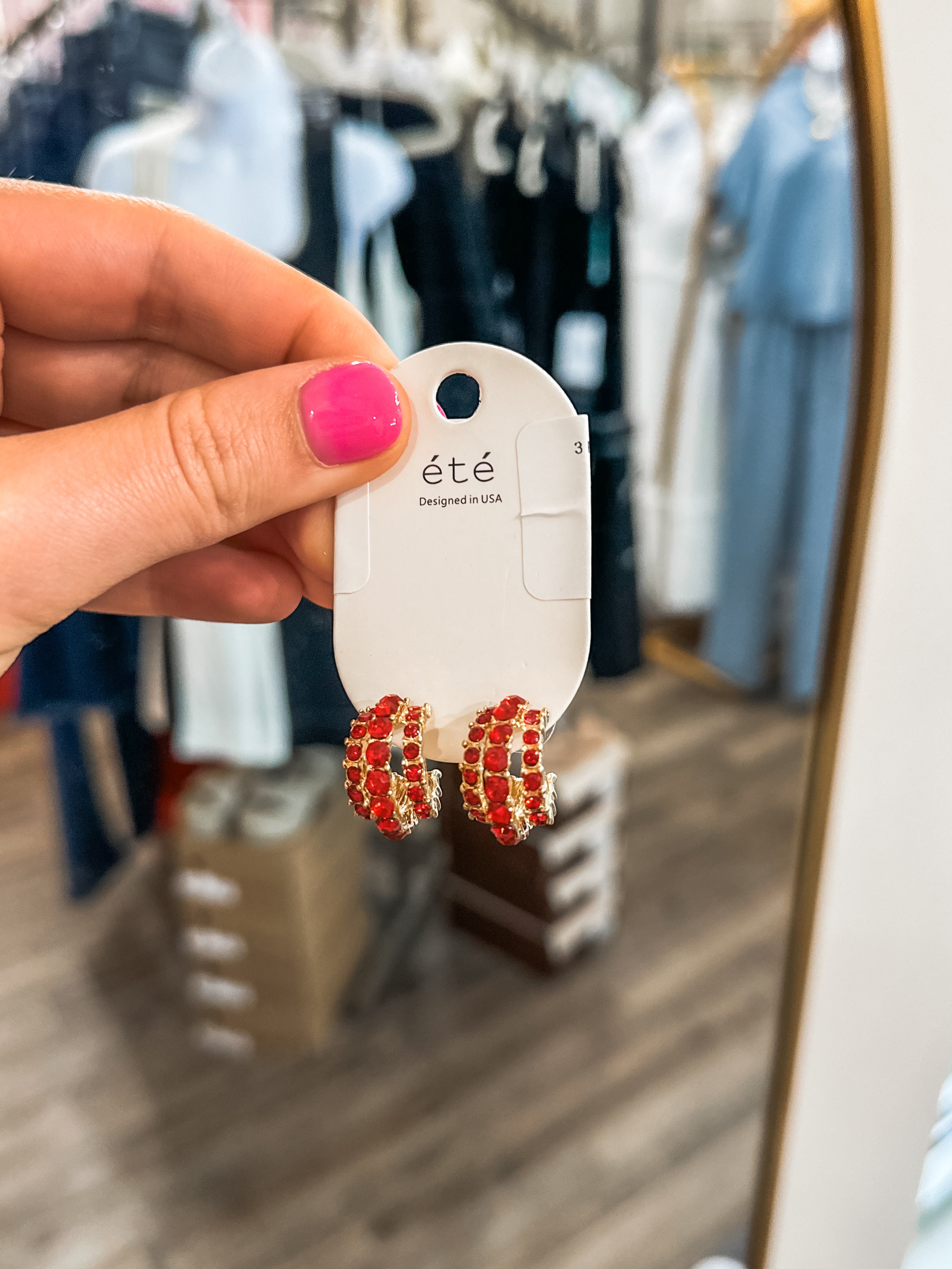 Bring the bold 💋 Our 3 Row Red Rhinestone Hoops feature sparkling crimson stones set in a triple-row gold-tone design for maximum shimmer in a petite .75” size. Lightweight yet eye-catching, these hoops are perfect for holiday parties, gameday glam, or adding a fiery pop to any outfit.