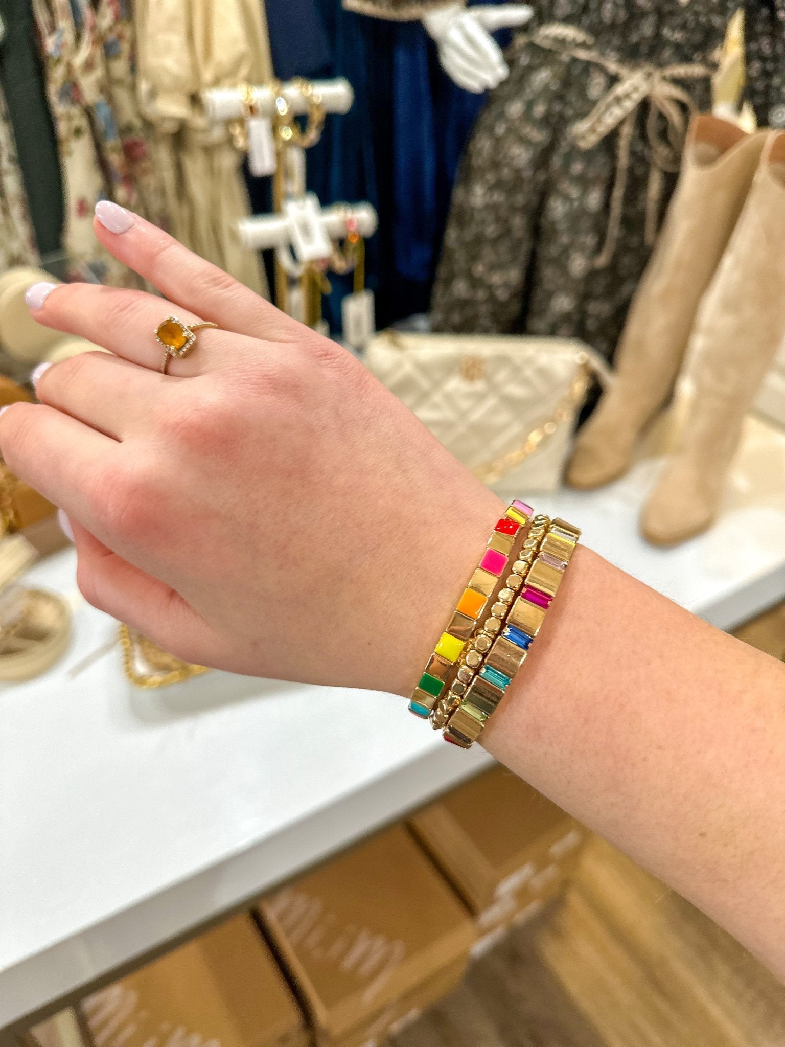 • Coordinating gold beaded stretch bracelet