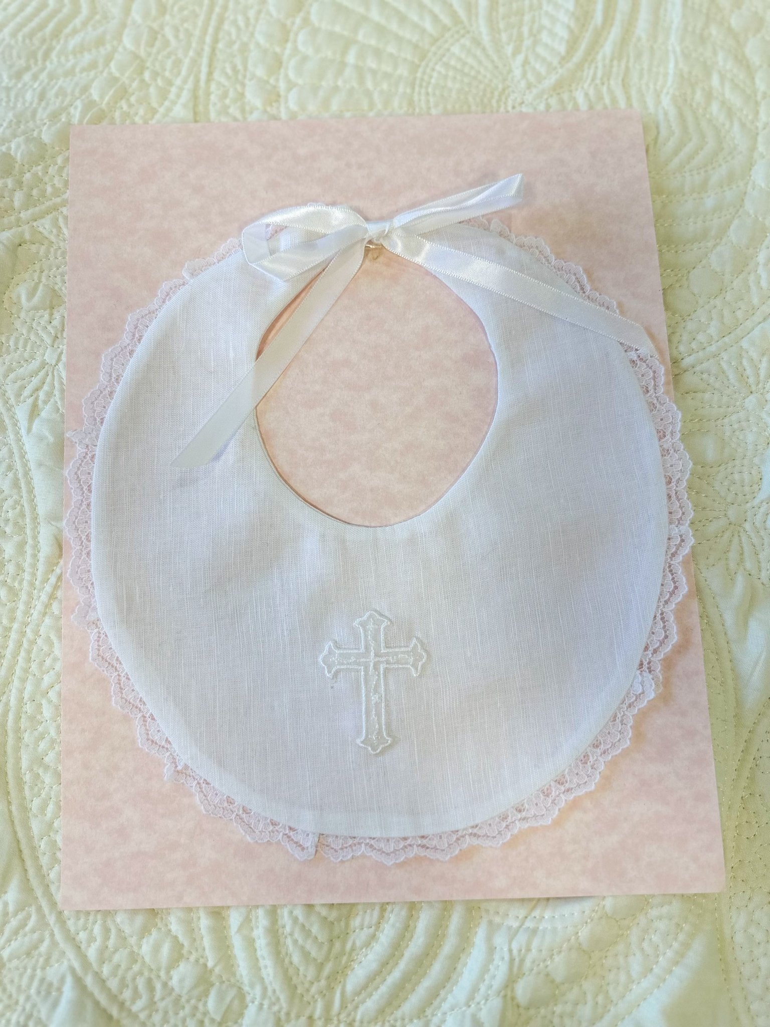 A sweet touch for your little one’s special day, the Baby Bib with Lace & Cross is both practical and meaningful. Designed with delicate lace trim and an embroidered cross, this bib is perfect for baptisms, christenings, or other faith-filled celebrations while keeping baby’s outfit protected in style.