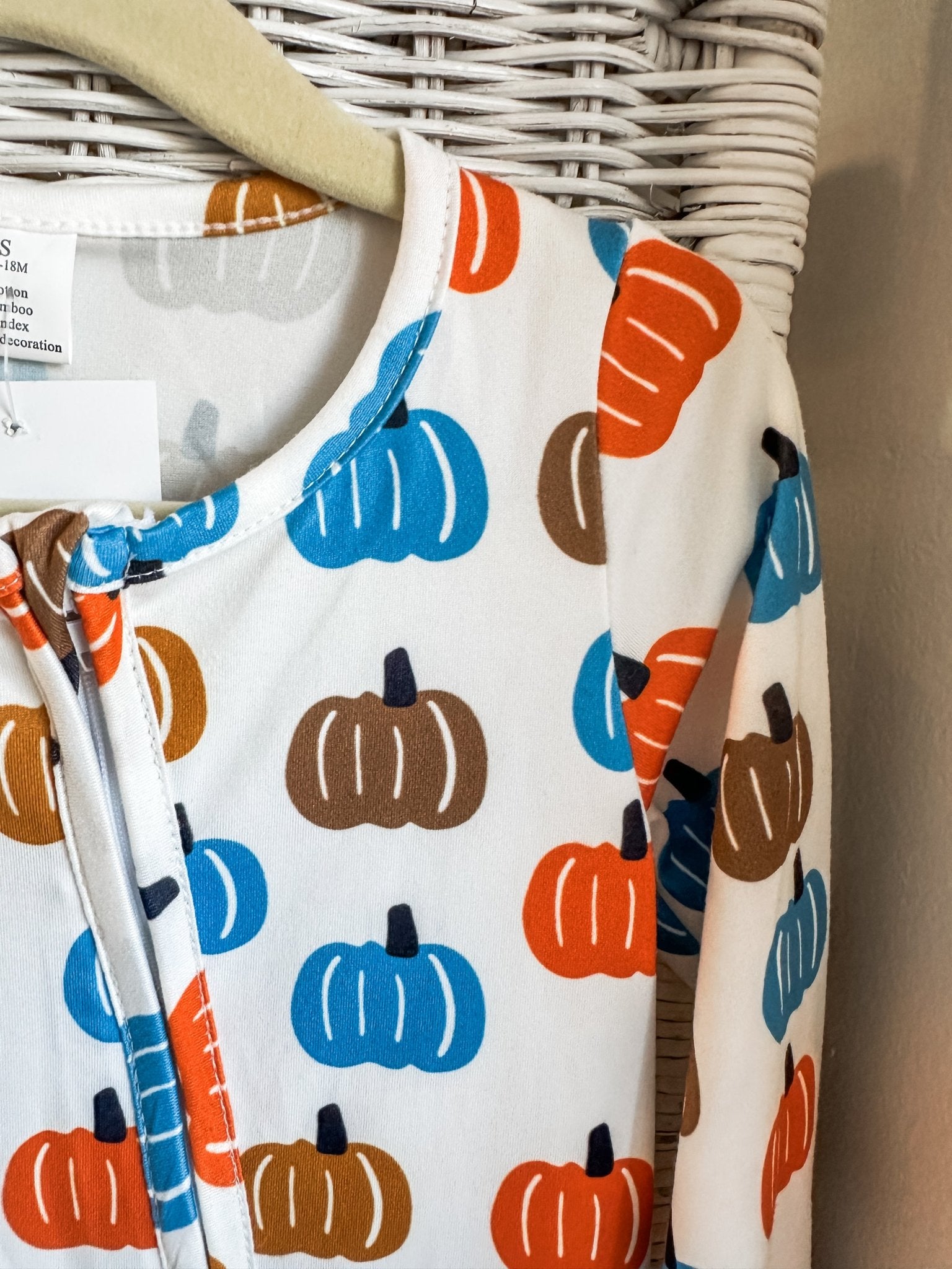 • White base with whimsical blue and orange pumpkin print