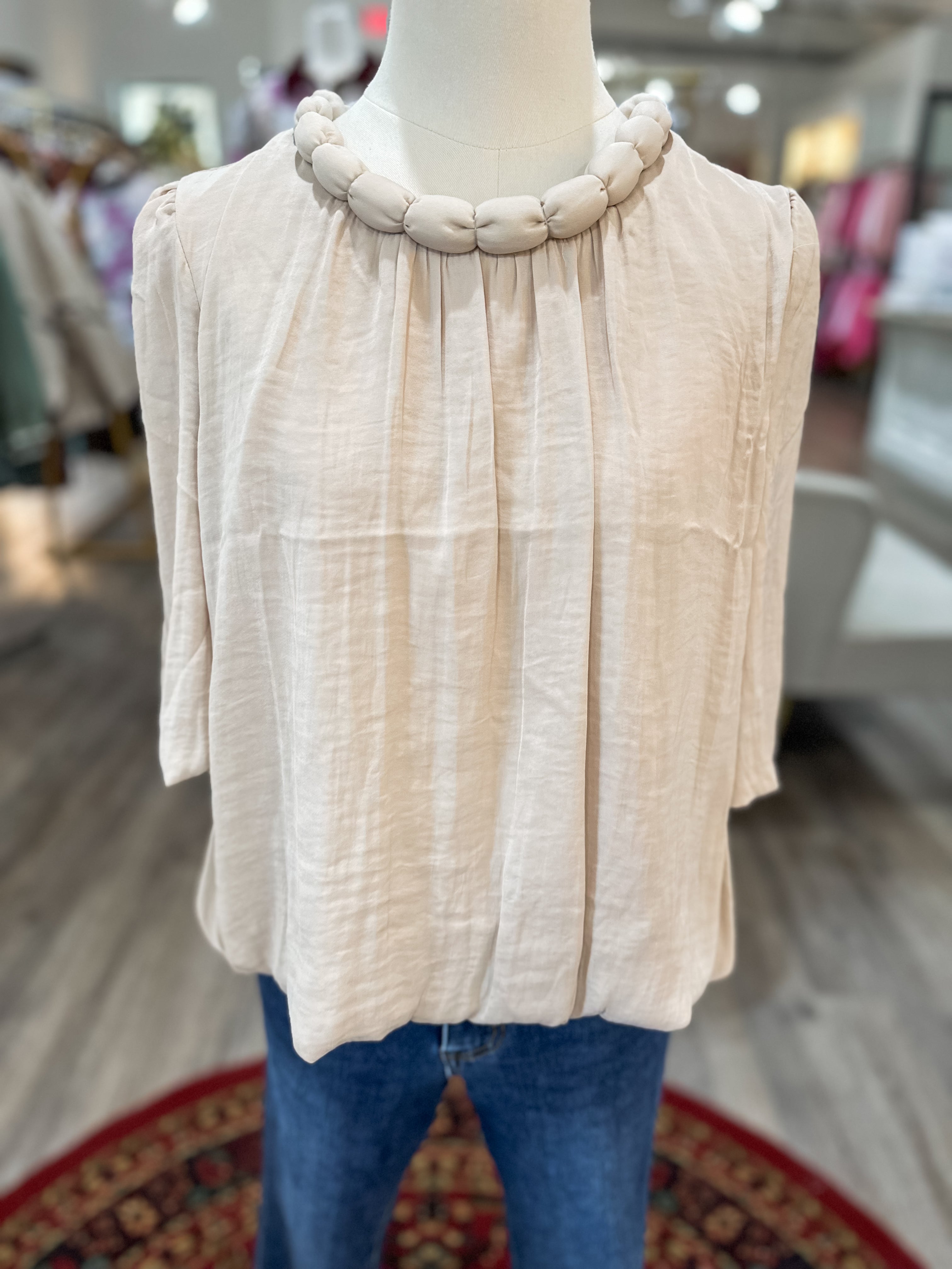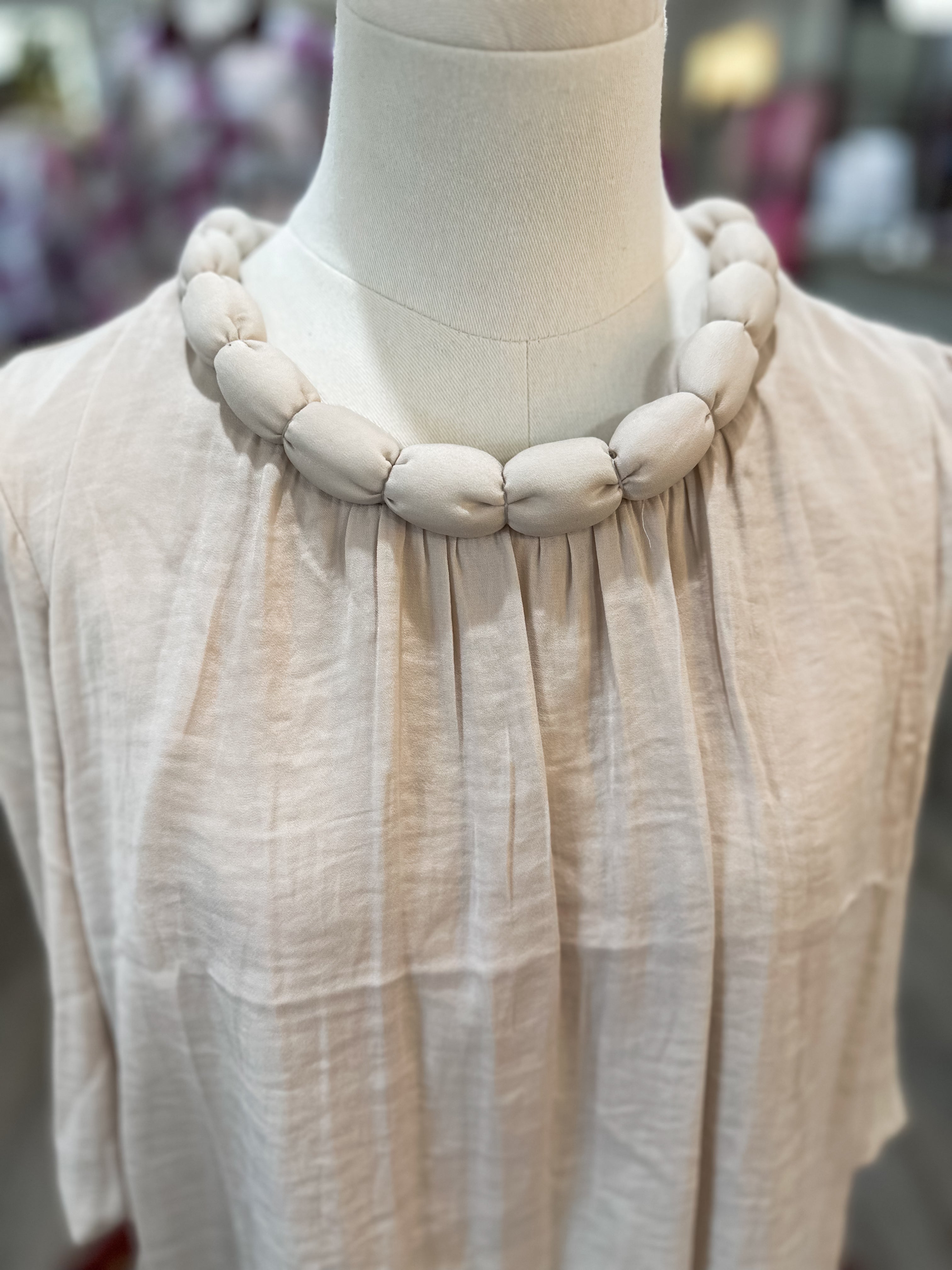 Soft, feminine, and effortlessly polished, this billowy blouse features a statement round neckline with a bold accent detail that instantly elevates the look. The flowy silhouette and lightweight fabric make it an easy choice for workdays, dinners, or styled casually with denim.