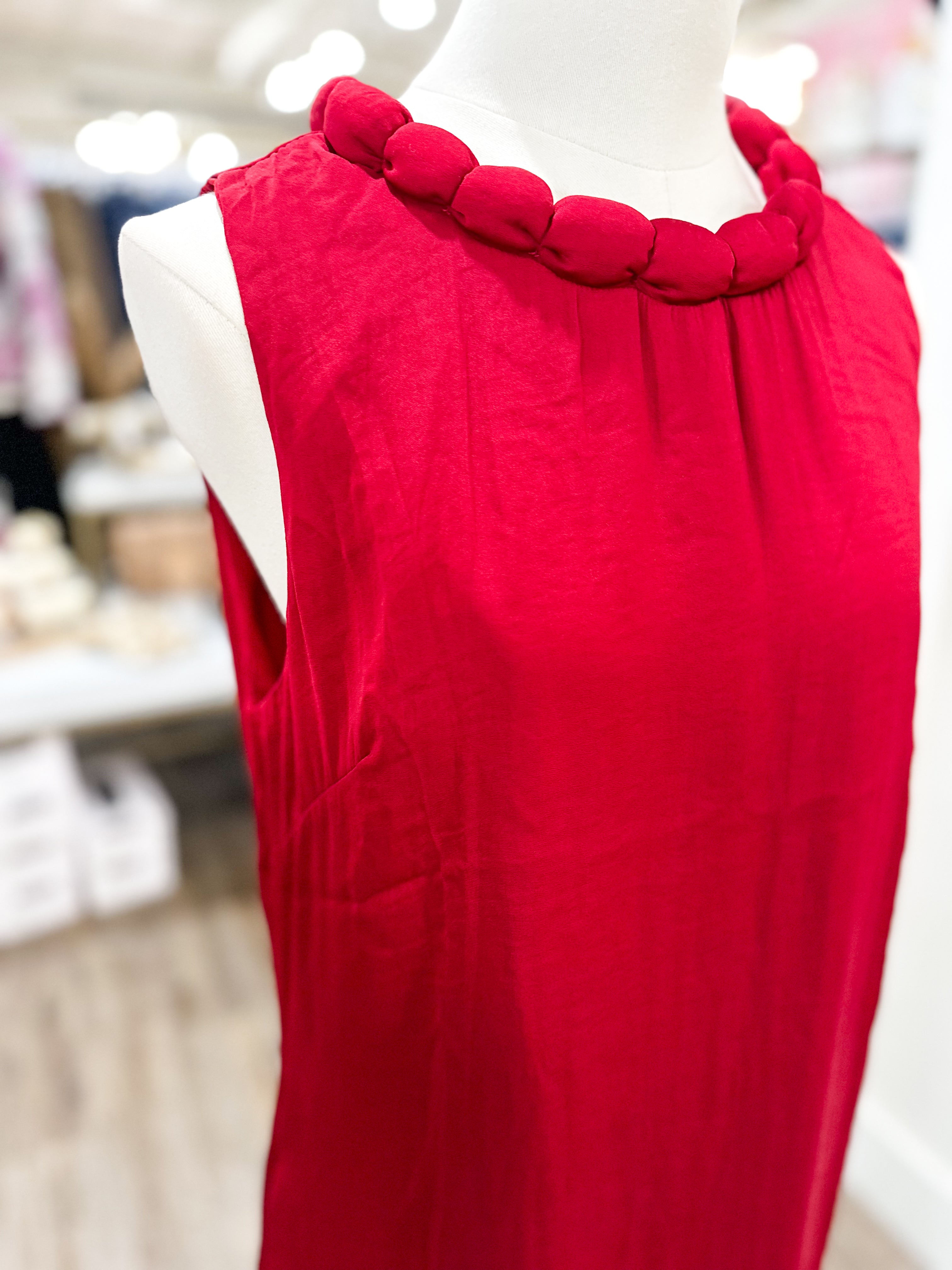A standout crimson red dress designed to make an effortless statement. With its bold color and billowy silhouette, this piece is perfect for holiday gatherings, dinners out, or any time you want an easy, polished look without overthinking it.