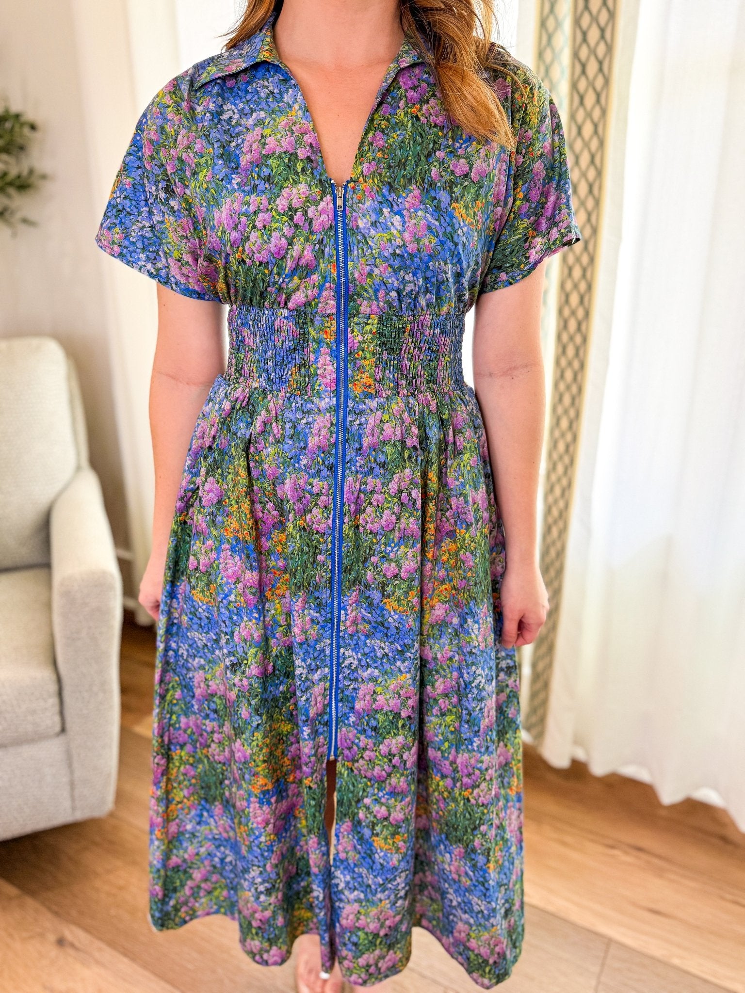 Design: Short sleeve midi dress with functional front zip closure, smocked waist, and full flowy skirt