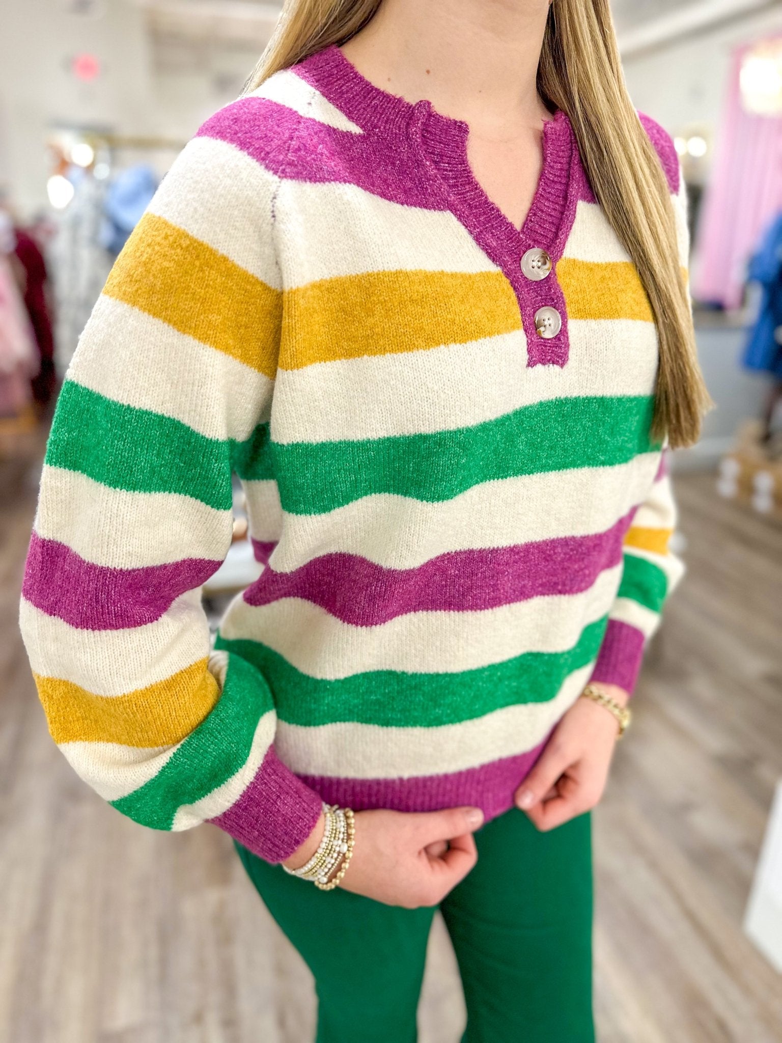A Mardi Gras classic you’ll reach for year after year. This stripe sweater features bold Carnival-inspired colors with a cozy knit feel that’s perfect for parade days, king cake runs, and everything in between. Festive without feeling over-the-top, it’s an easy favorite for the season.