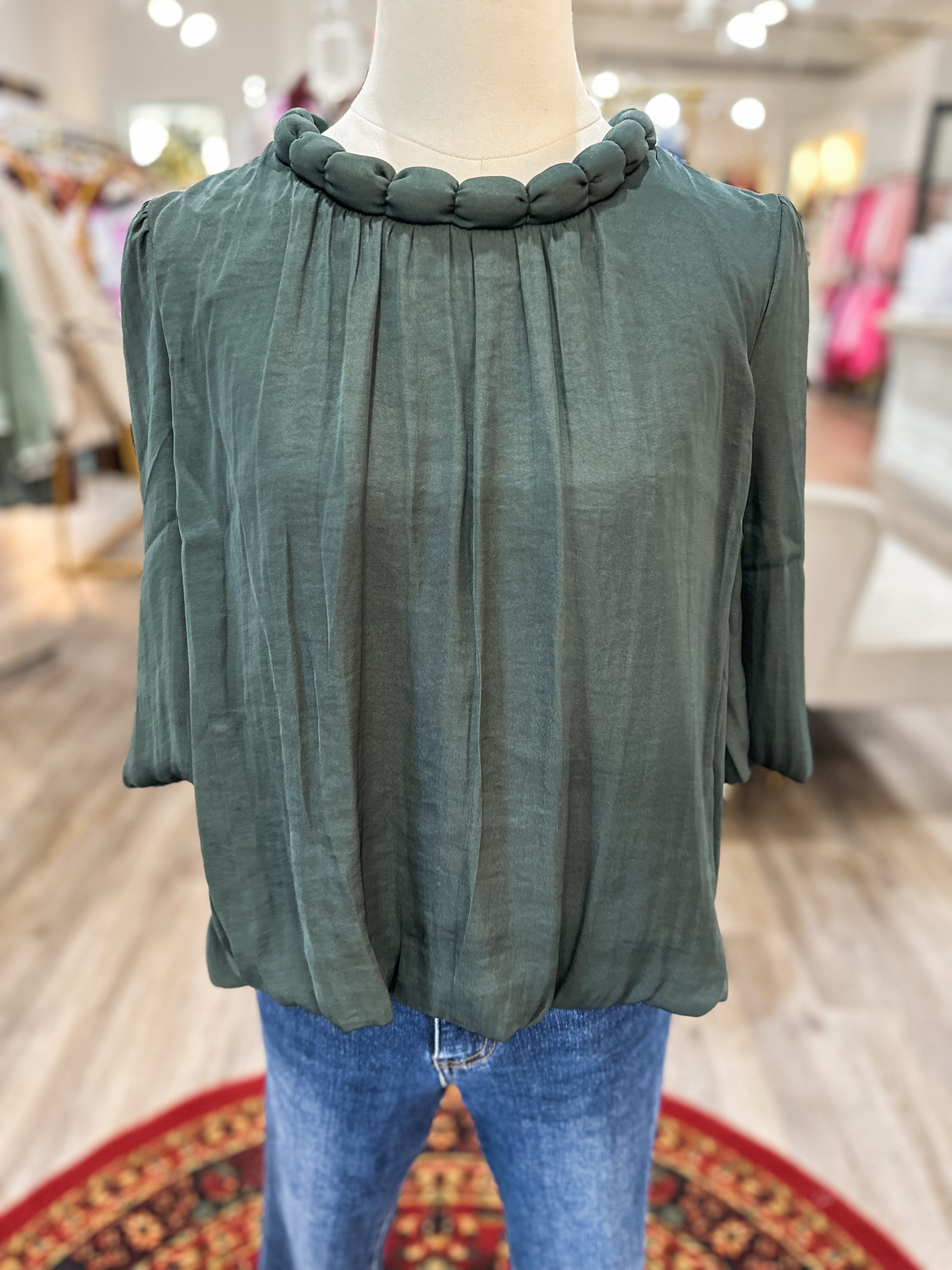 Soft, feminine, and effortlessly polished, this billowy blouse features a statement round neckline with a bold accent detail that instantly elevates the look. The flowy silhouette and lightweight fabric make it an easy choice for workdays, dinners, or styled casually with denim.