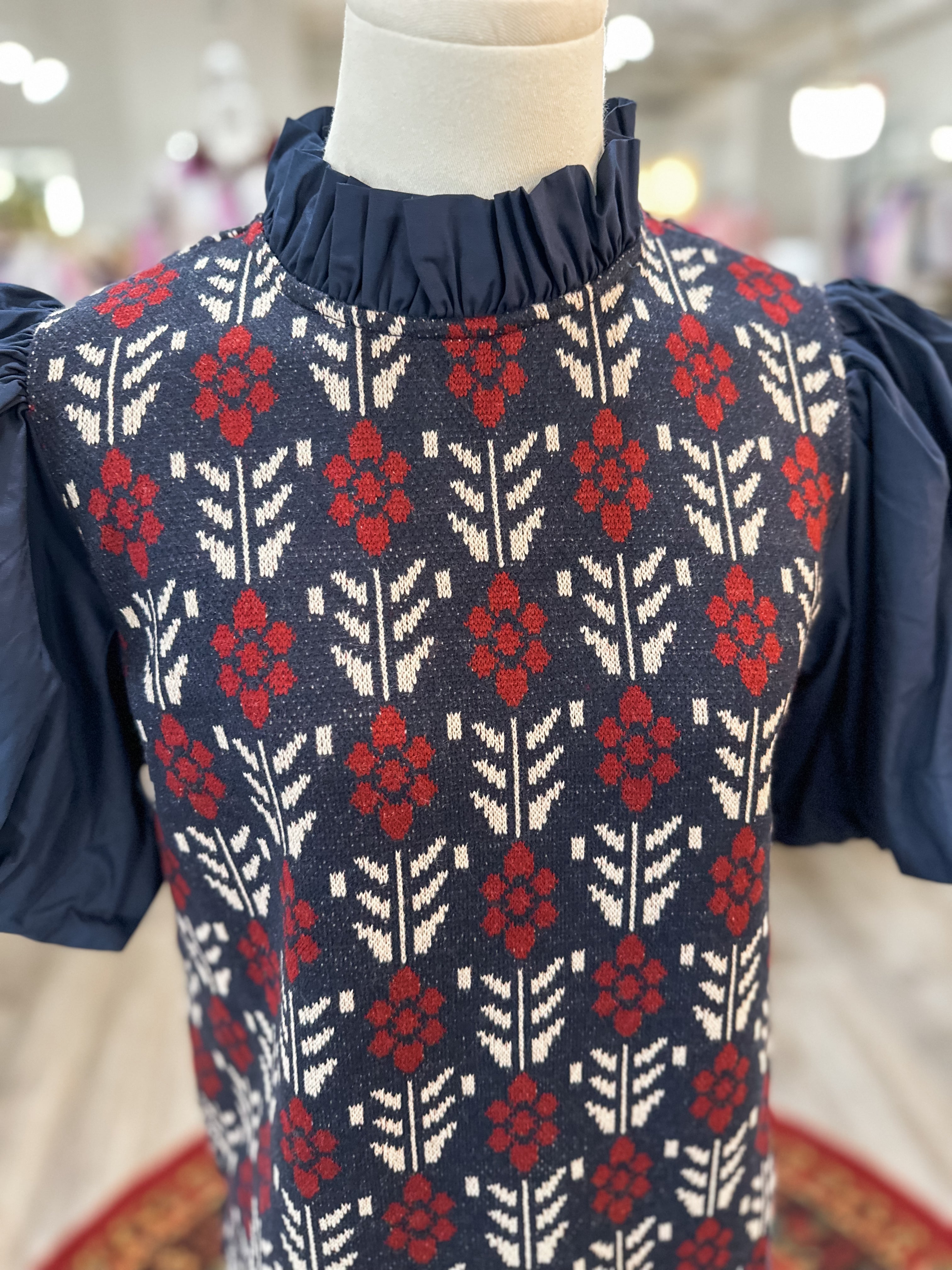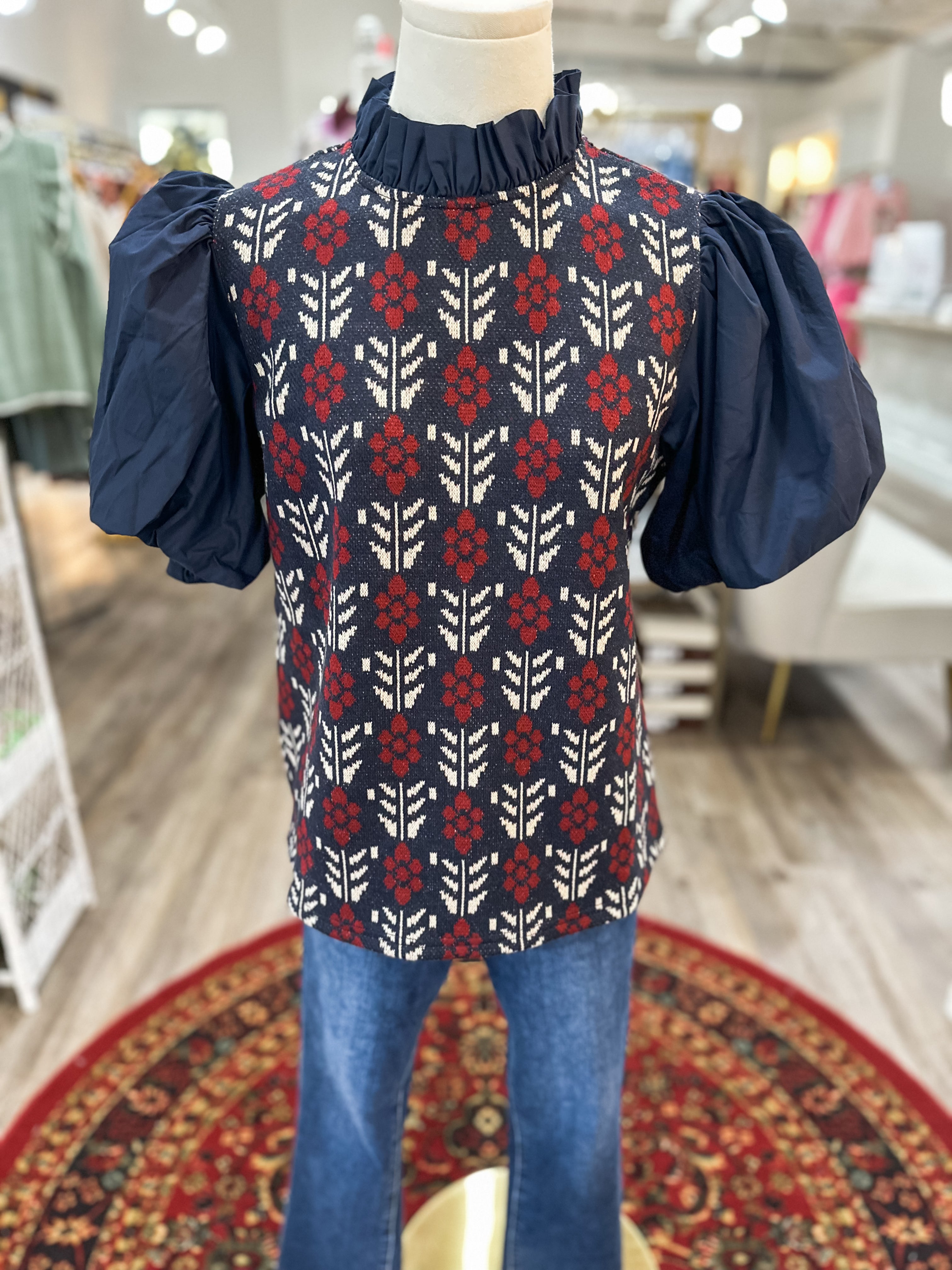 A statement top that blends classic charm with a bold, feminine touch. The Navy & Red Daisy Row Puff Sleeve Top is perfect for dressing up your everyday denim or pairing with trousers for work, church, or seasonal gatherings. The rich color palette and eye-catching pattern make this one a standout you’ll reach for again and again.