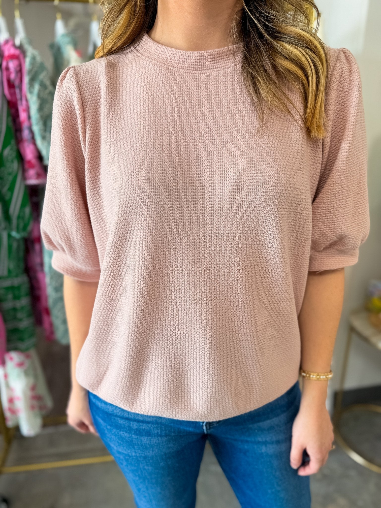 Design: Short sleeve textured knit top with round neckline, subtle puff sleeve detail, and relaxed straight fit