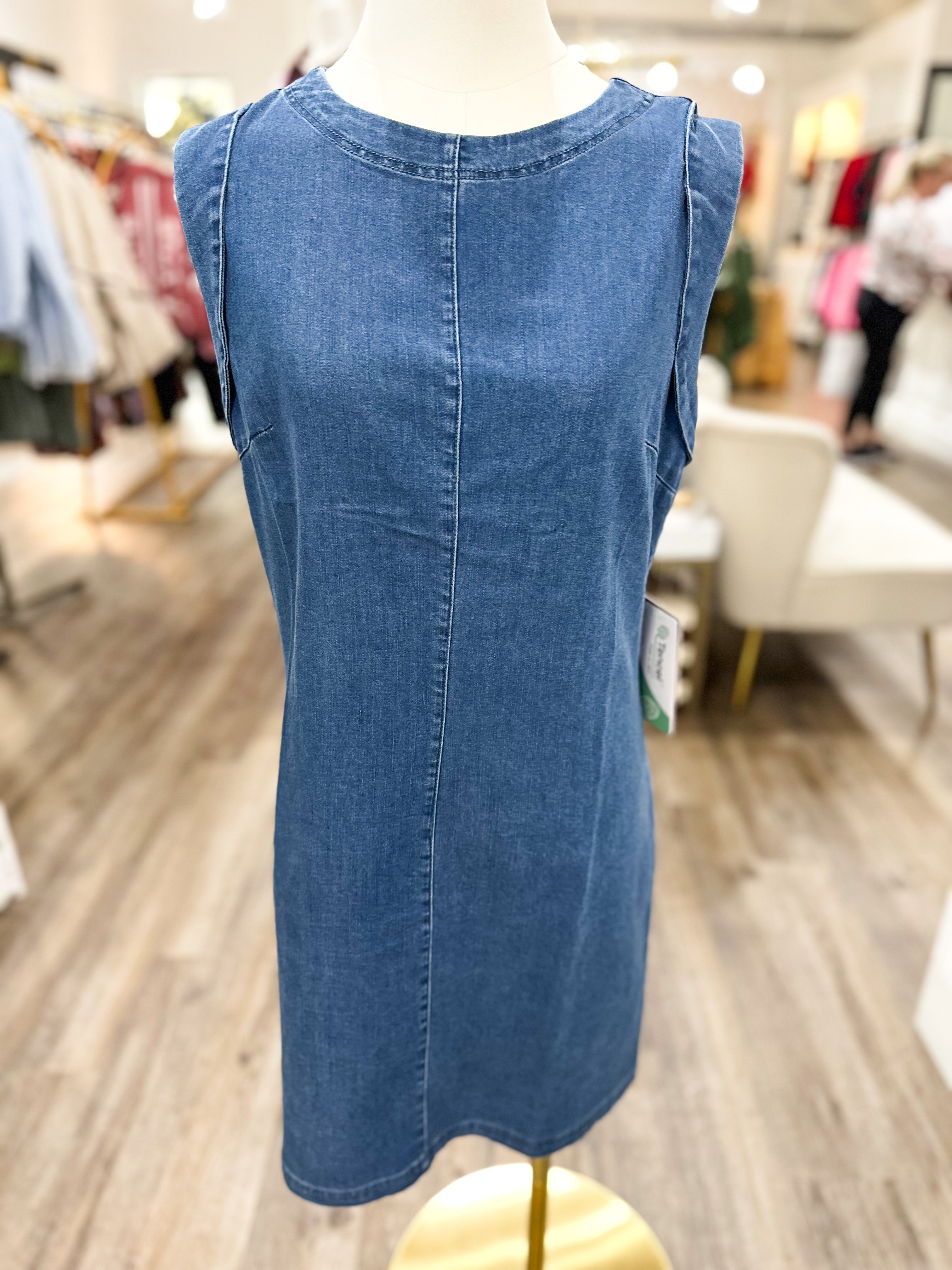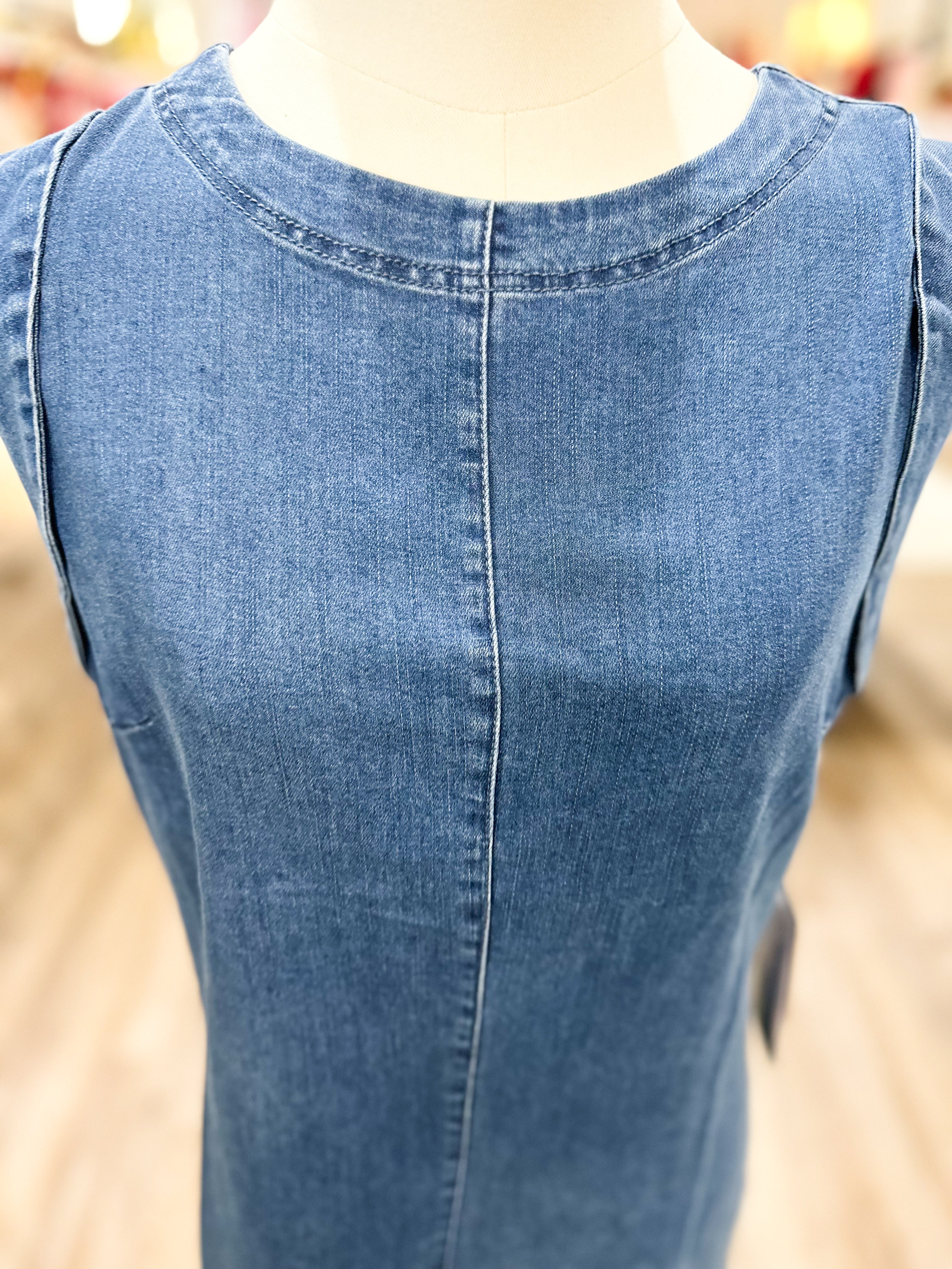 A timeless denim dress with clean lines and subtle structure, this sleeveless shift is an effortless staple you can style year-round. Easy to dress up or down, it’s the kind of piece that works just as well with sandals now as it does layered with boots later.