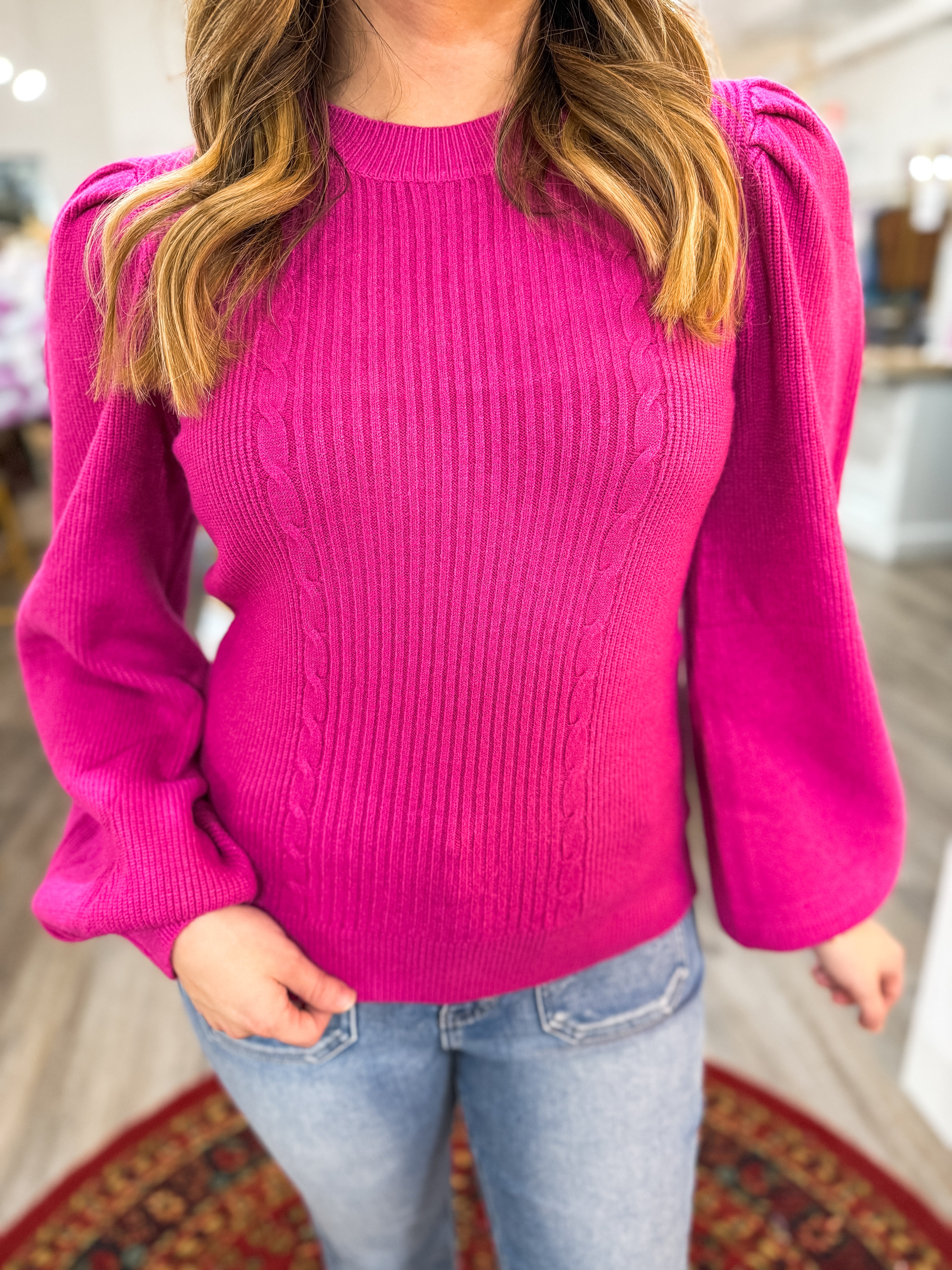 The pop of color your winter wardrobe needs! This vibrant violet-magenta sweater brings together a classic cable-knit texture with a modern, feminine silhouette. Perfect for holiday events, office days, or adding a cheerful splash to your everyday denim.