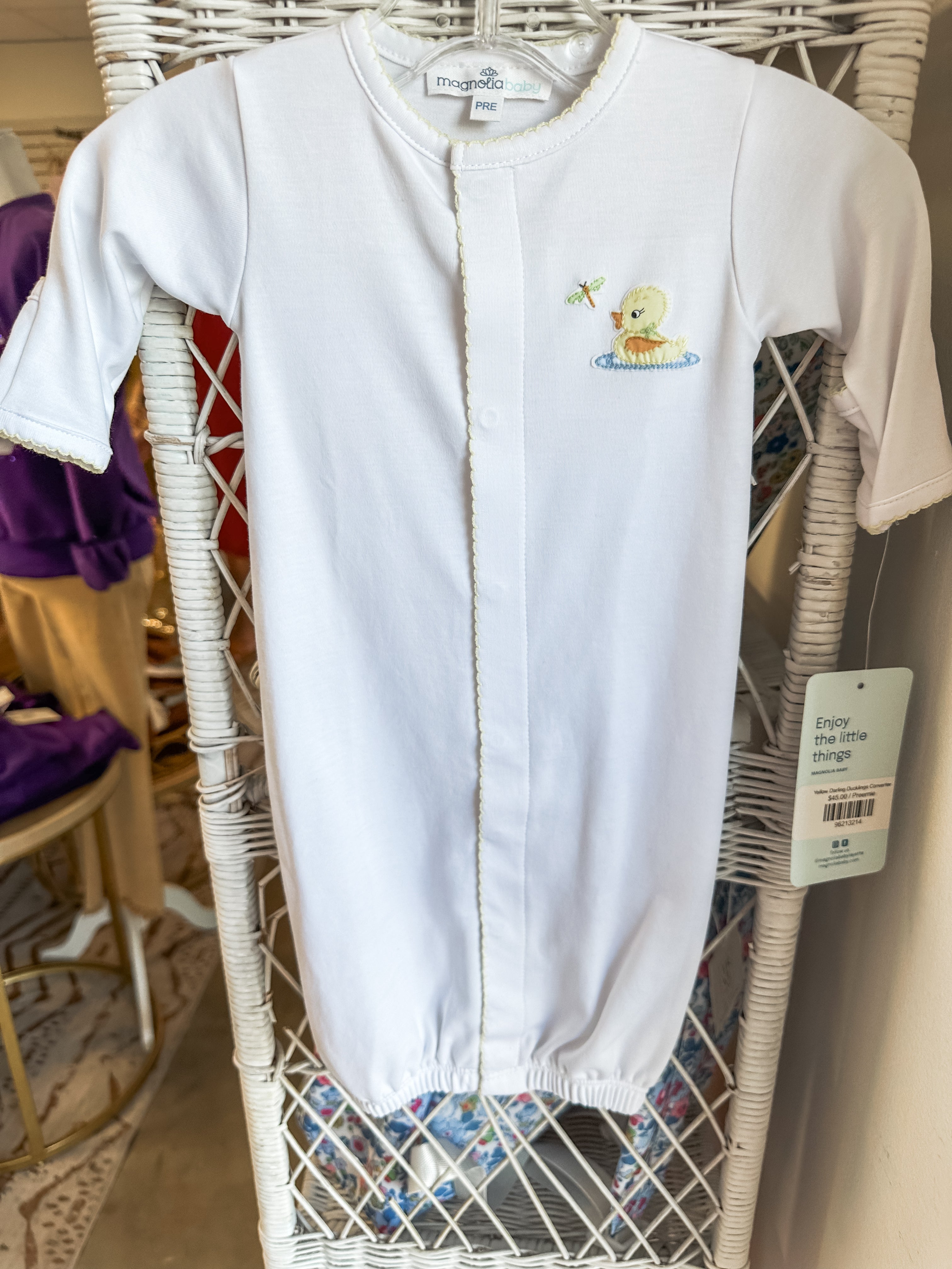 Soft, sweet, and perfect for sleepy snuggles—this darling duckling converter gown is a newborn must-have. Designed with delicate yellow scallop trim and a hand-embroidered duckling motif, this magnetic converter easily switches between a gown and footie thanks to its innovative magnetic closures. It’s cozy, practical, and picture-perfect for baby’s first days.